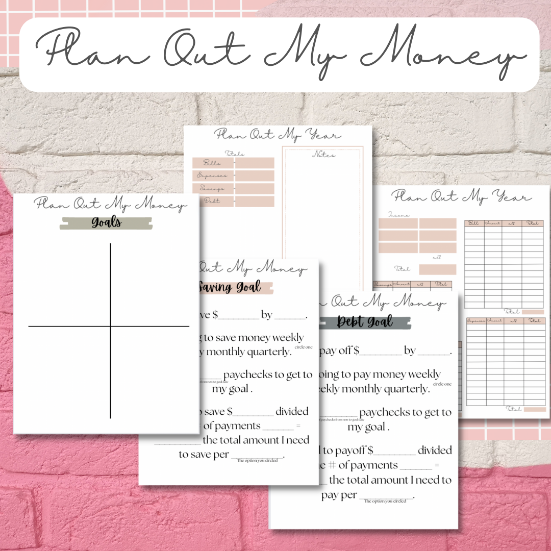 Plan out your money for the year ahead with this printable! This printable includes 5 pages that will guide you to list your goals, your monthly expenses, as well as a breakdown of how much you spend a year.